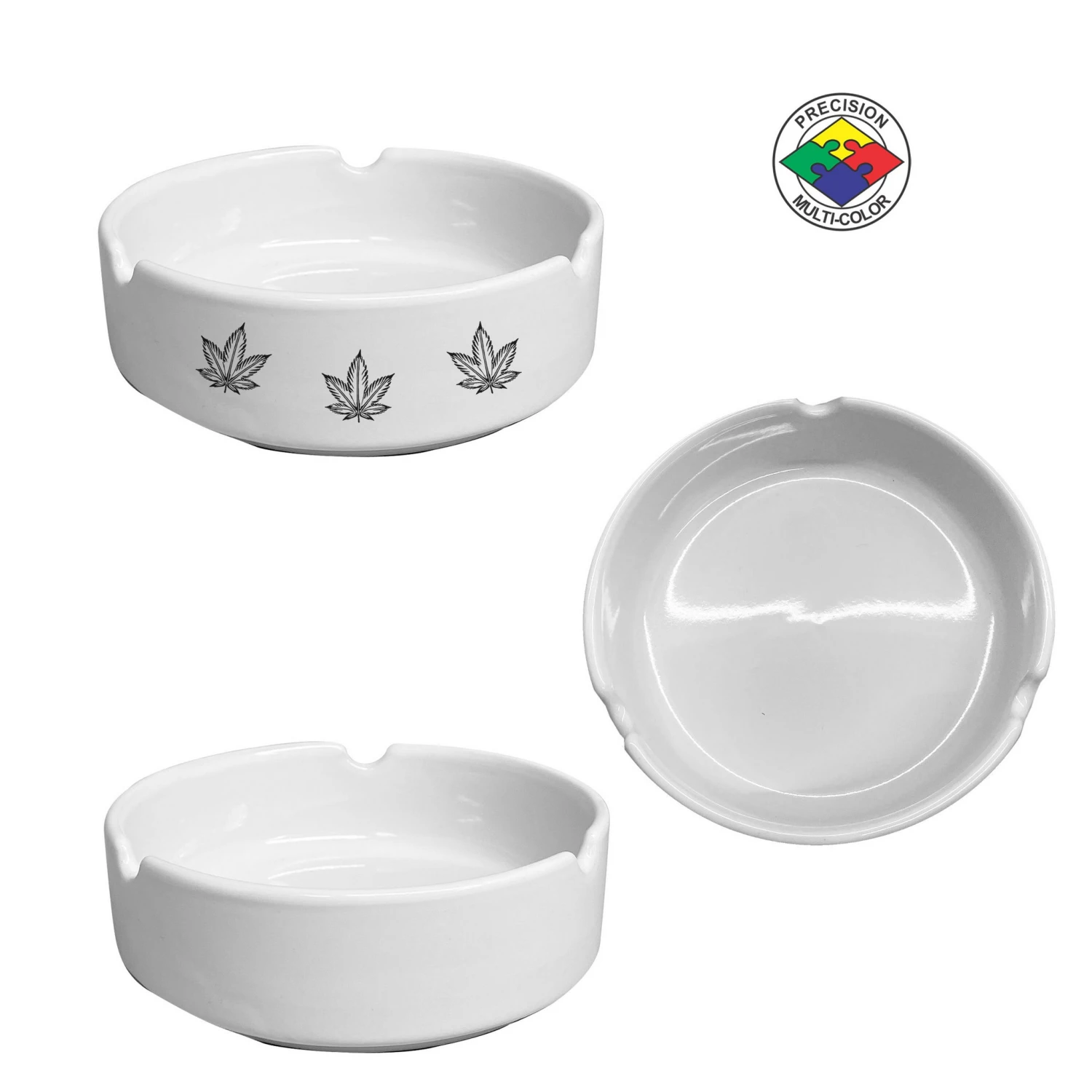 4 1/2″ Round Ceramic Ash Tray. Imprinted with the spot color process and organic polymer ink. Use your complex logo! Our precise imprinting is 4x better than industry standard. Prop 65 compliant: lead-free and cadmium-free. Imprint on the ceramic ashtray, one color in 3 locations, between the notches on the side or inside tray at additional cost. Multi color available in one location. Complies with Prop 65. 4.5″ Diameter