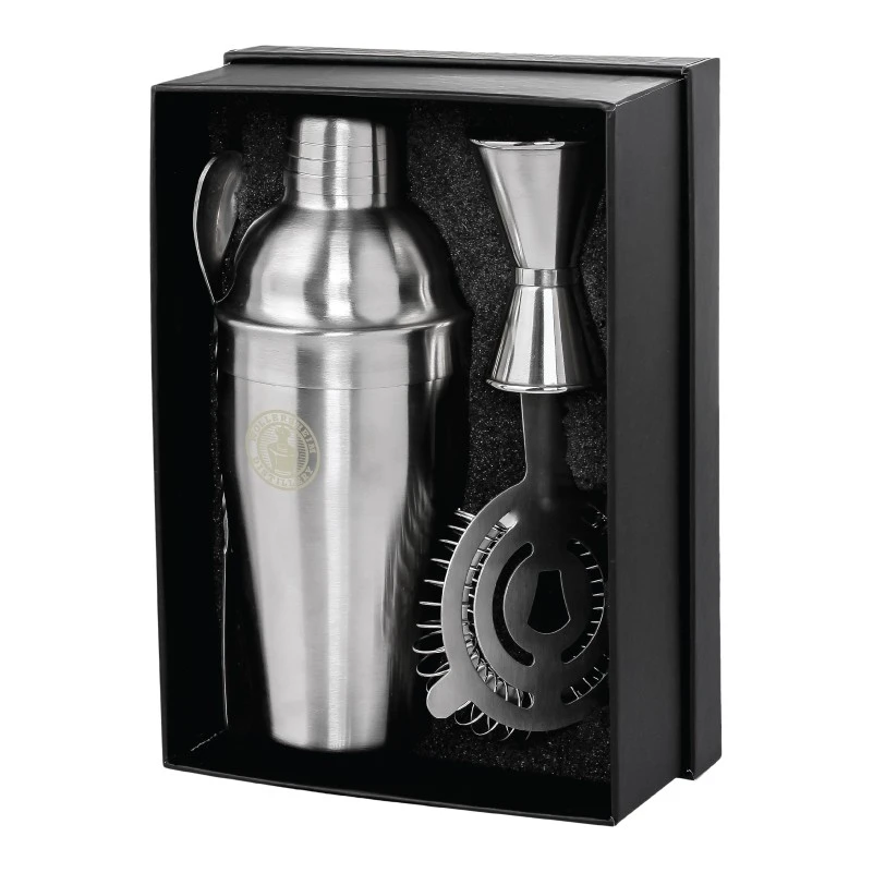 The perfect gift for any home mixologist or enthusiast. This bartender kit contains a full stainless steel kit of an 18 oz. stainless steel cocktail martini shaker, double sided jigger, mixing spoon, and cocktail ice strainer, all packaged together in a heavy duty cardboard gift box. Kit contains laser engraving on the cocktail shaker. 1 setup charge applies. 6 1/2″ L x 9″ W x 3 1/2″ H