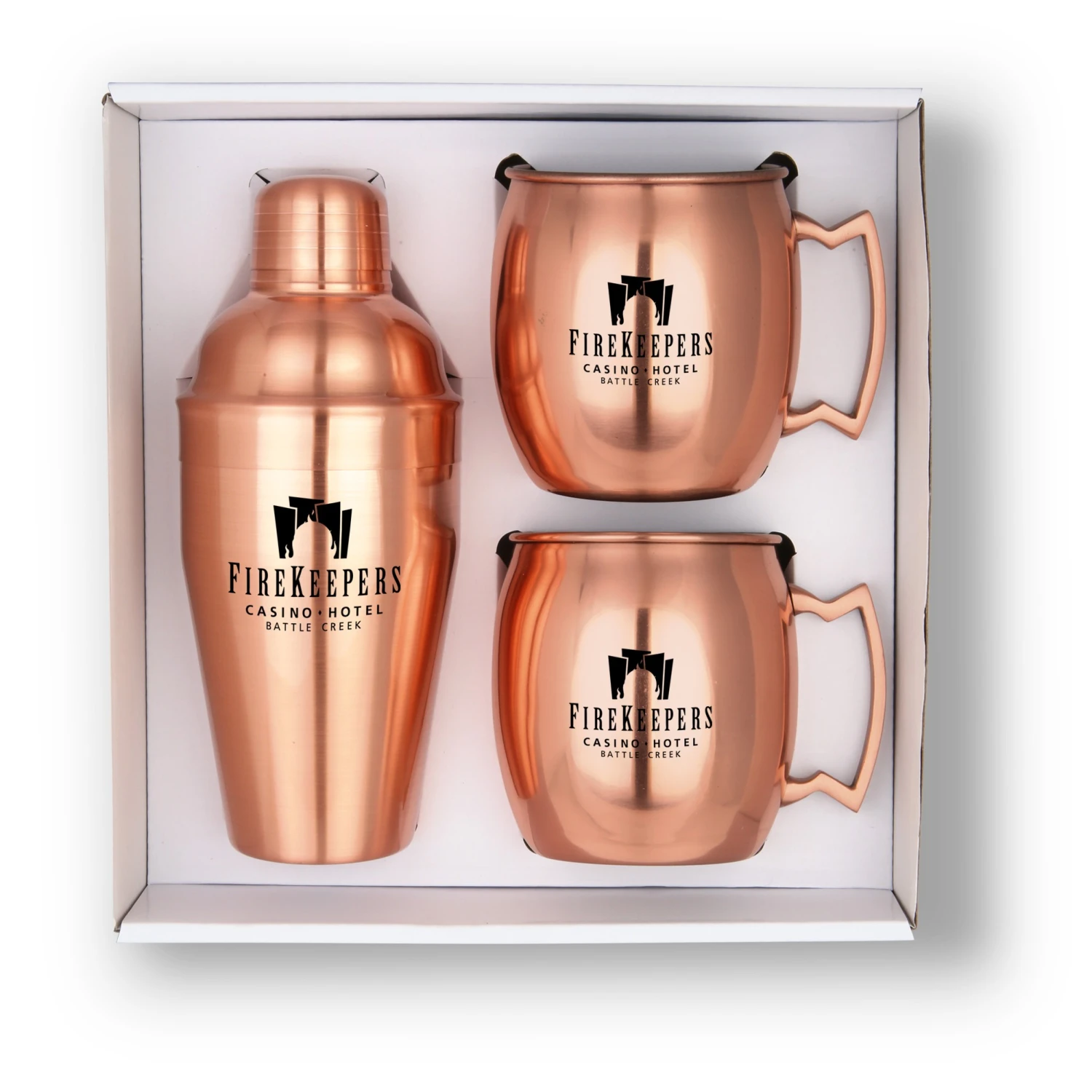 This set includes an 18 Oz. Cocktail Shaker, and 2 Moscow Mule Mugs 19 Oz. White gift box is also available in stainless steel, please inquire. 12″ L x 9.5″ W x 4″ H