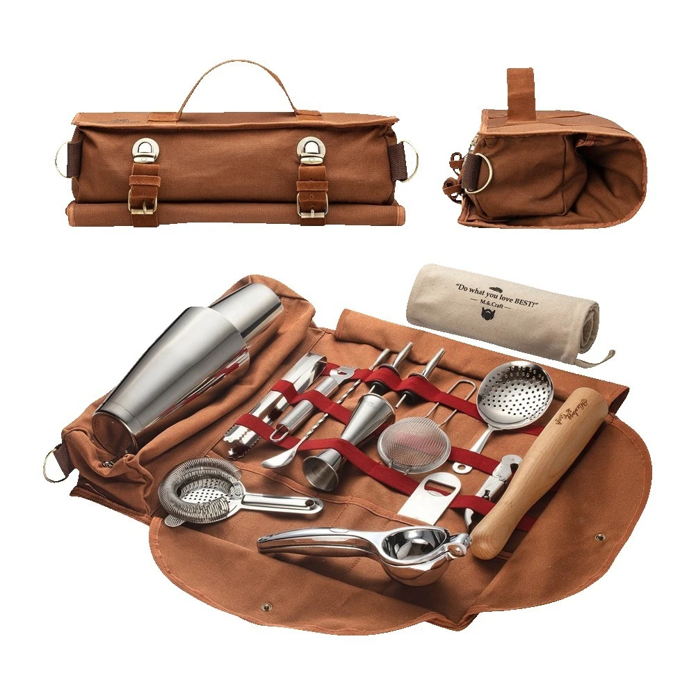This elegantly appointed wholesale Deluxe Bar Bag keeps your bartending utensils and essentials safe in timeless, classic style. This 17-piece, all-inclusive kit features rust-proof 18-oz. and 28- oz. SST-grade Boston cocktail tins; 1/1-¾-oz. (30/50-ml) double-sided jigger, featuring both imperial and metric markings; 10″ wooden muddler made of genuine, quality beech wood; 10″ mixing spoon; Hawthorne strainer; julep strainer; fine mesh strainer; 2 liquor pourers; lemon squeezer.