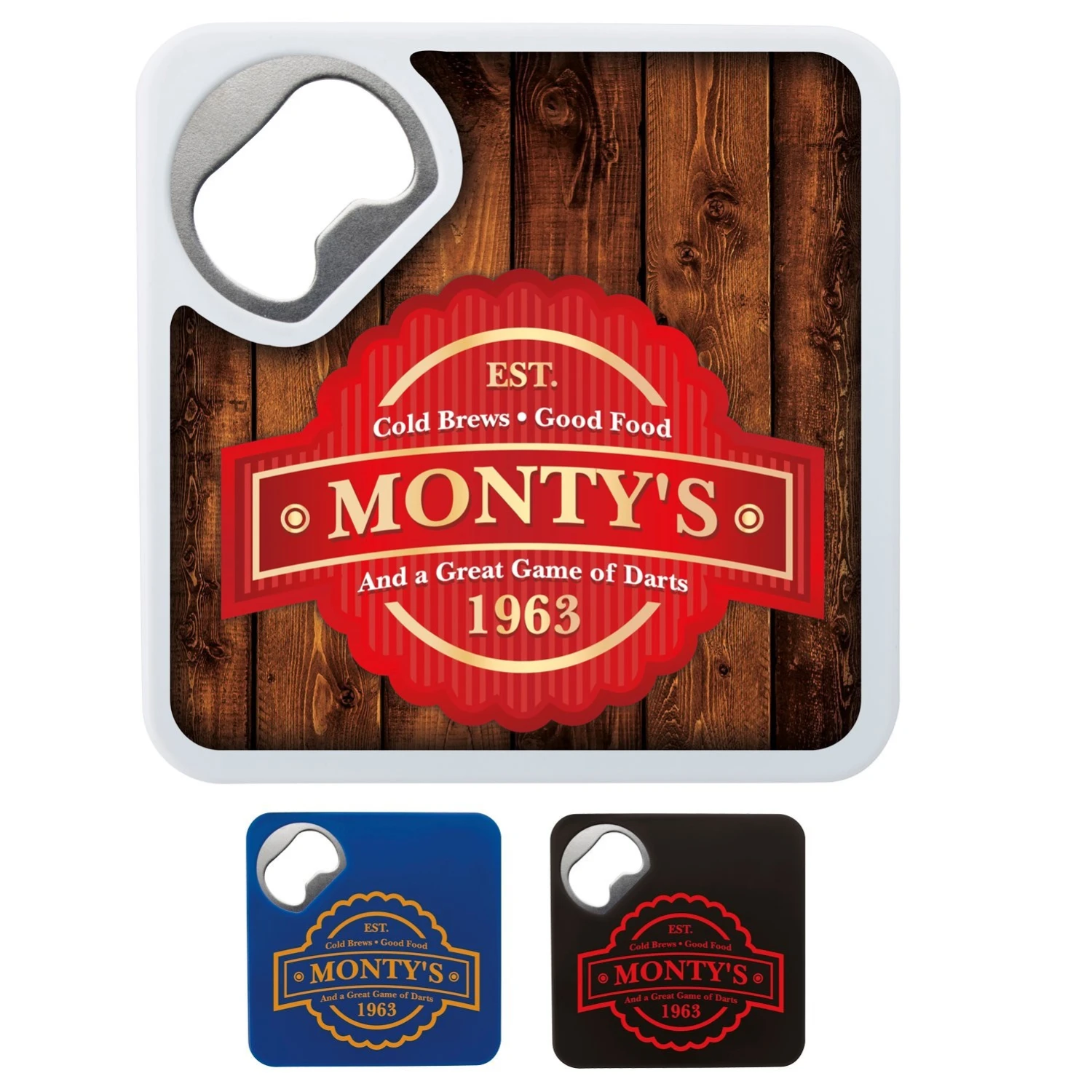 This unique item doubles as a bottle opener and a coaster! Keep your message present time and time again. Great for mailings and giveaways. Complies with Prop 65. 3 1/4″ W x 3 1/4″ H x 1/8″ D