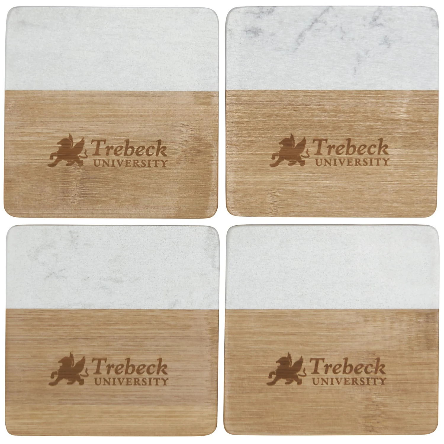 Each item in the four-piece Marble and Bamboo Coaster Set is square with rounded corners, perfect for your coffee table, office desk, or nightstand. Natural variations in the marble give each piece a unique, hand-crafted look, making these coasters truly one-of-a-kind. Due to the nature of the bamboo material, variations in laser imprinting quality may occur.Set includes 4 coasters Constructed from bamboo and marble Square design with rounded cornersNatural stone variations make each coaster. Complies with Prop 65. 1.57″ D x 4.02″ W x 4.02″ H