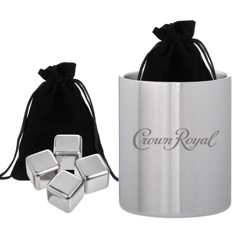 10 oz. brushed finish stainless steel old fashioned whiskey glass perfect for your favorite scotch, bourbon or cocktail. Includes 4 pack of stainless steel whiskey stones in a drawstring pouch. Vintage look and feel fits great in any bar, restaurant, or home collection. Price includes engraving on cup. 3 5/8″ L x 3″ Diameter