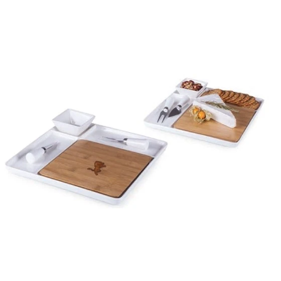 Ceramic serving tray and nested bamboo cutting board featuring a ceramic bowl and two full-tang cheese tools.