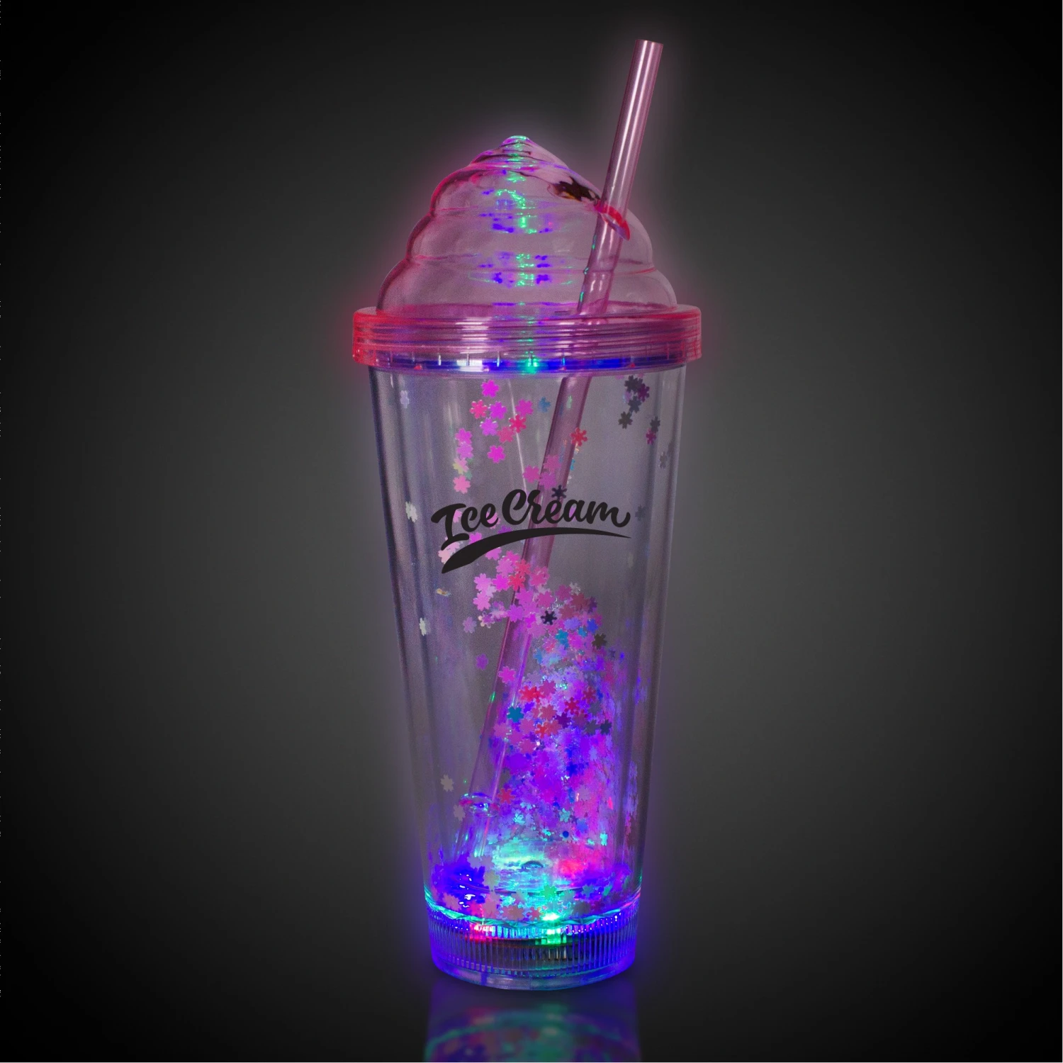 Serve your signature cold summer favorite in our Pink Ice Cream LED Tumblers. Between the double walls are cute iridescent snowflakes to give your drink a frosty cold look. Each cup comes with bright multicolor LEDs that light up your brand in 3 different function modes with the push of a button. Each LED Tumbler comes with 3 replaceable AG13 batteries (included and installed), an ice cream shaped dome lid and matching clear pink straw. Hand wash only.