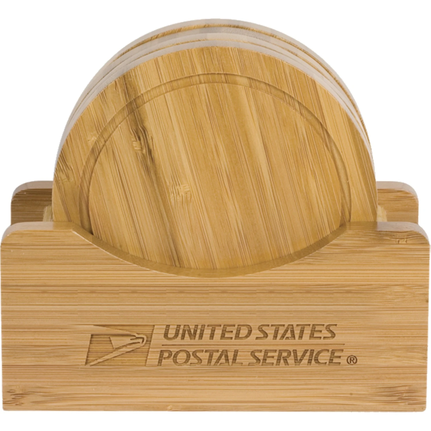 This comely set of 4 grooved bamboo coasters comes complete with bamboo holder. 5.25″ W x 4 1/2″ H x 2″ D
