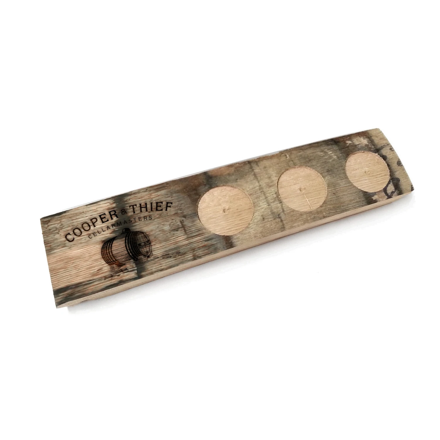 If looking for the authentic whiskey barrel staves, look no further. The material we use for this item is from real, solid oak barrel staves. They smell, look and feel like the real thing. Every flight will be slightly different in color, smell, texture and width. However, the length will stay consistent to accommodate 3 routs. The routs will be created at the time an order is placed. Therefore, we can customize your flight board to fit your glasses. Extra deep laser engraving is available. Complies with Prop 65. 3.5″ W x 14″ L