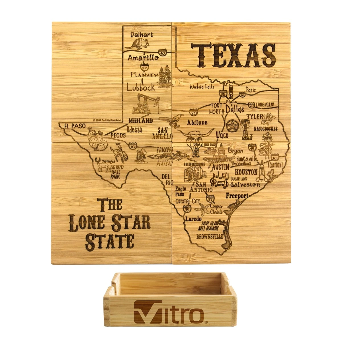 This State Puzzle Coaster Set with Case offers a natural solution for protecting tabletop. These sturdy coasters are crafted from organically-grown Moso® bamboo, an environmentally-friendly material solution that quickly re-grows once harvested. Bamboo is both lightweight & durable a perfect choice for coasters! The coaster set includes a handsome case to store coasters neatly when not in use. The coasters are easy to care for as well: simply wipe them with a damp cloth to clean. Complies with Prop 65. 4″ W x 4″ H