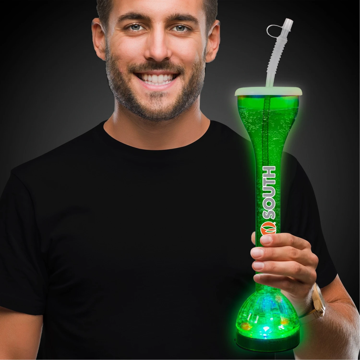 No spills and all fun with our 17 oz. Transparent Green LED Yard Glass with attachable lid and plastic straw with its own attached lid. Each yard glass is approximately 14″ tall with multicolor lights on the bottom. Slide the switch on the bottom to activate the 6 bright LED lights. 4 non-replaceable LR44 batteries included and installed. Perfect for serving your signature drinks at parties, bars, restaurants, festivals, and more! Hand Wash Only. Not safe for microwave or dishwasher. 14″ H