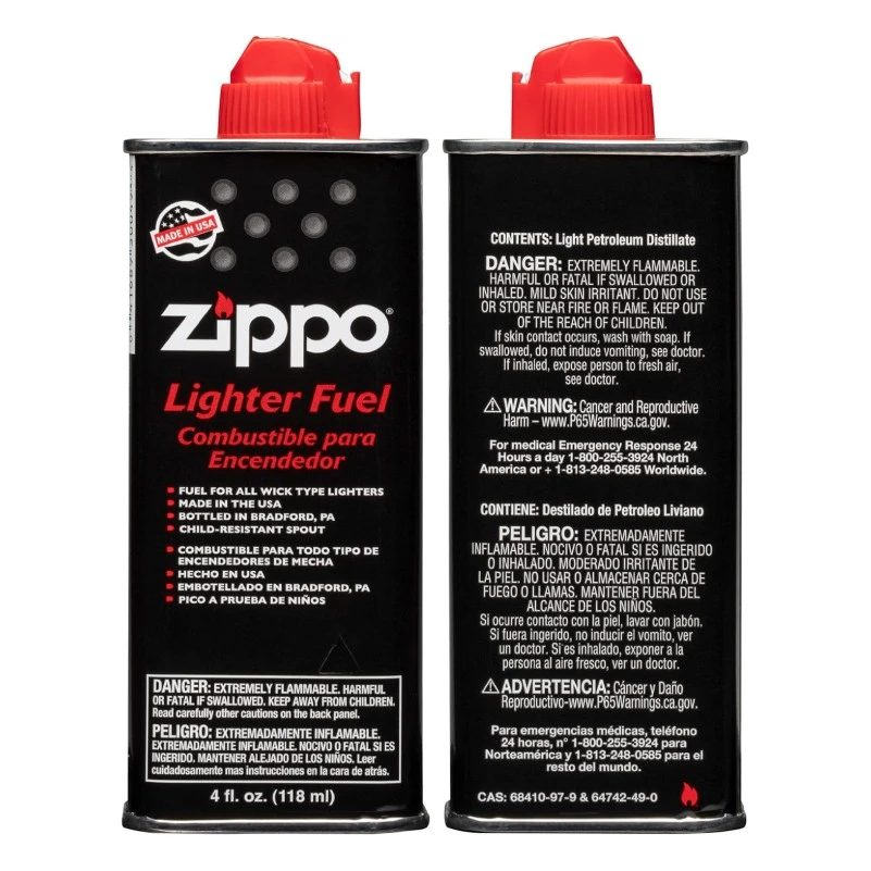 Zippo naphtha lighter fluid refill for use with our LT201 product. 4 oz. can. Clean burning and low odor fluid. One can refills approximately 17 windproof lighters. 5″ H x 2″ W